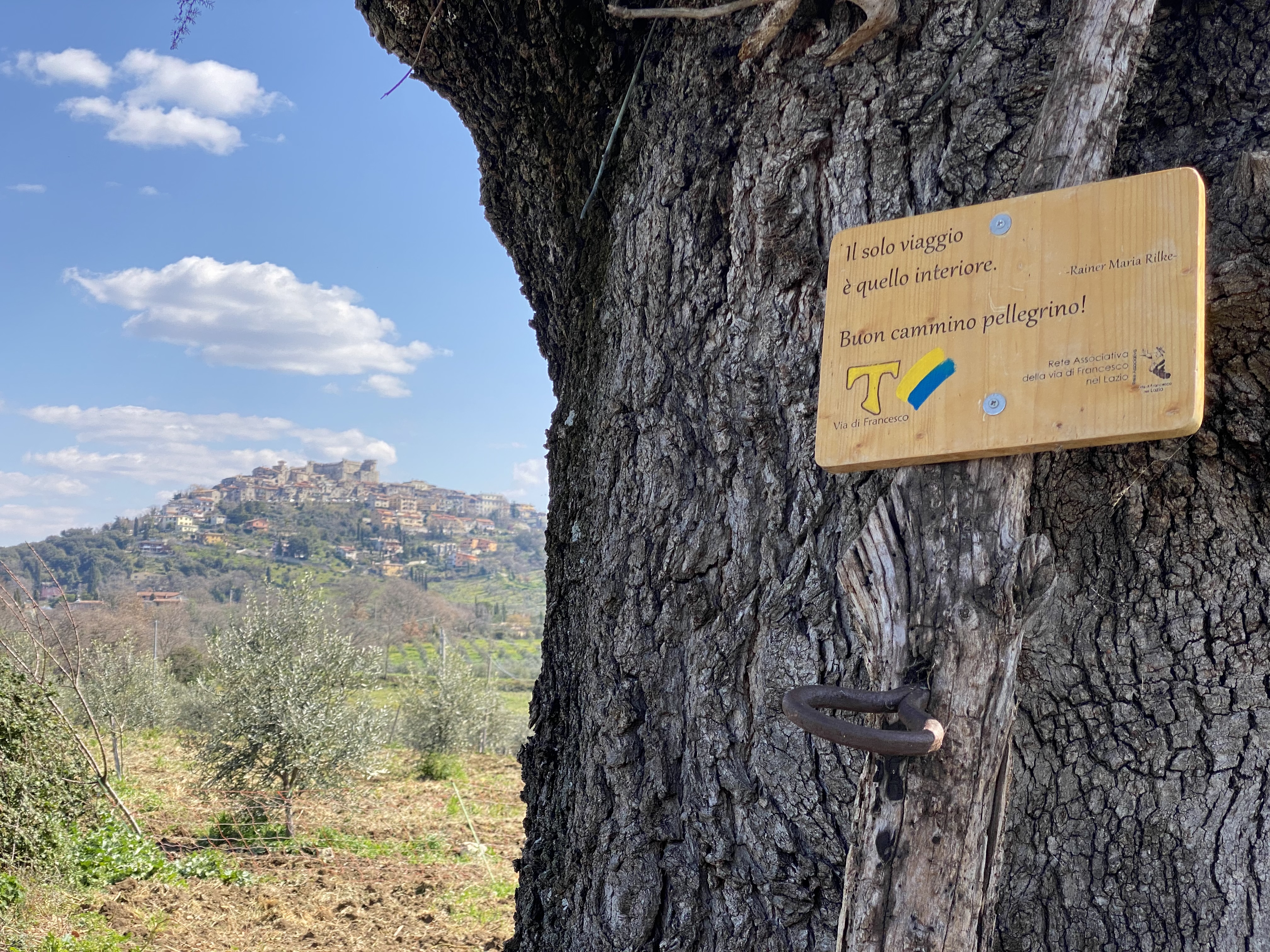 Leaving Rieti, pilgrims climb into hills dotted with farms, oak woods, and stone villages before reaching Poggio San Lorenzo, long a stop for travelers along the ancient Via Salaria. The path rolls south to Ponticelli, crossing agricultural land and quiet valleys. The walk to Monterotondo is the longest stage, crossing ridge lines and open countryside toward a lively hill town with sweeping views toward Rome.