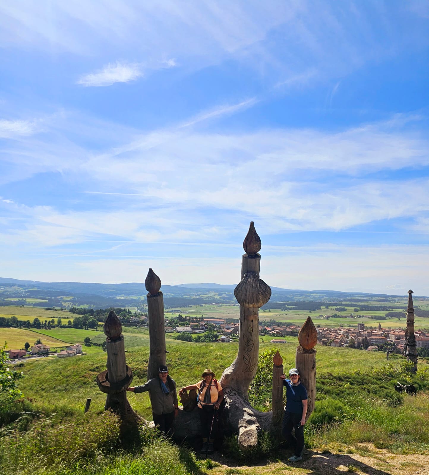 A spectacular and challenging day with a long ascent. We leave St Privat and in a few kilometers, we reach the iconic Chapel of St. James of Rochegude overlooking the Allier valley. We then descend through a trail that is occasionally steep into the valley floor. After a short up and down, we reach Monistrol d’Allier, where there’s a restaurant, café, and the availability of rafts for river descent and a small beach. From here begins the challenging 7 km ascent. We pass by the Chapel of Magdalene where you can get a stamp for your credential, and continue almost to the end of the climb where we can stop for a picnic. After walking 5 km with slight ups and downs mainly through pastures, we start descending for 4 km, passing by beautiful wooden sculptures, until we reach Saugues. Overnight in Saugues.