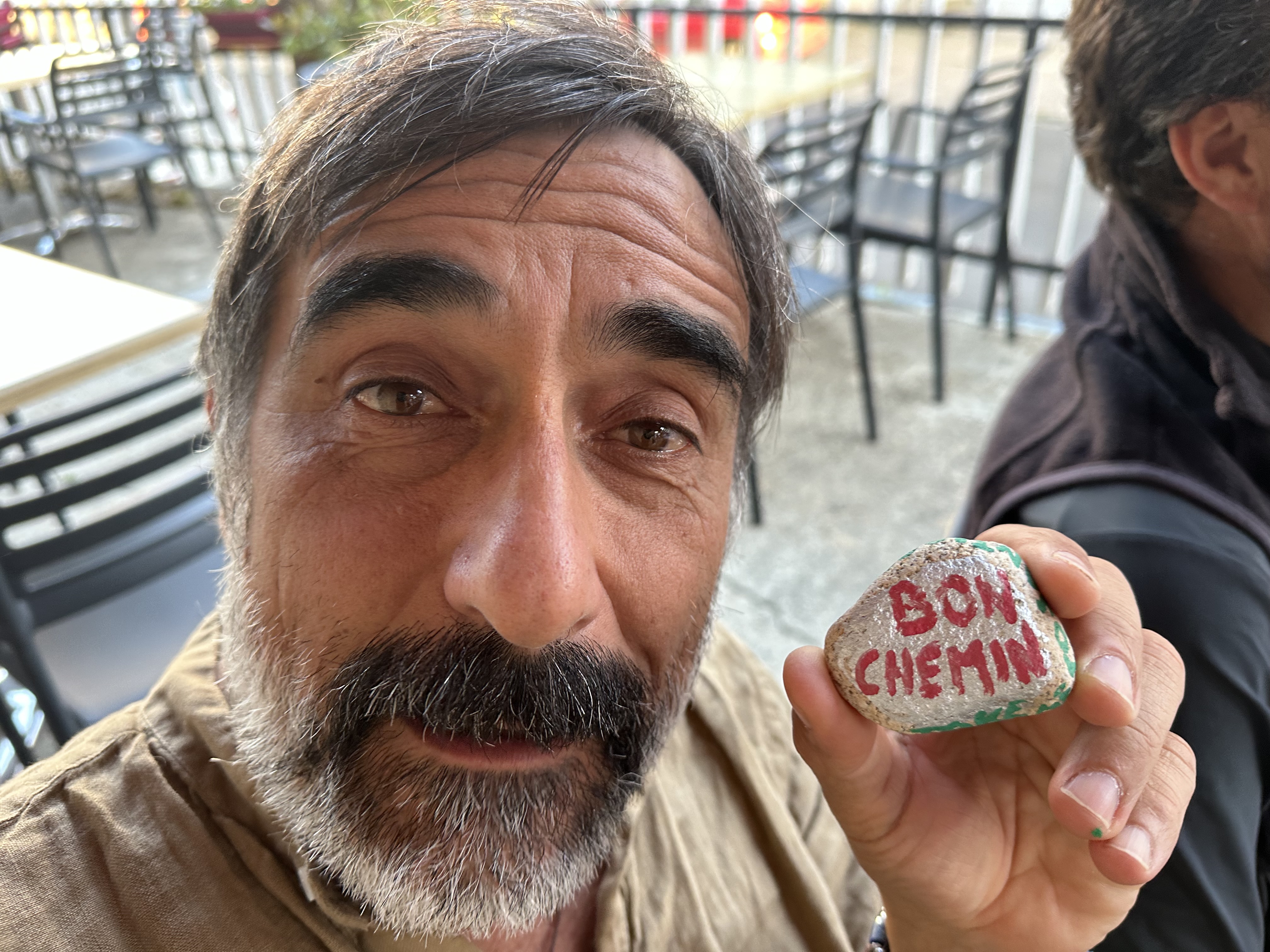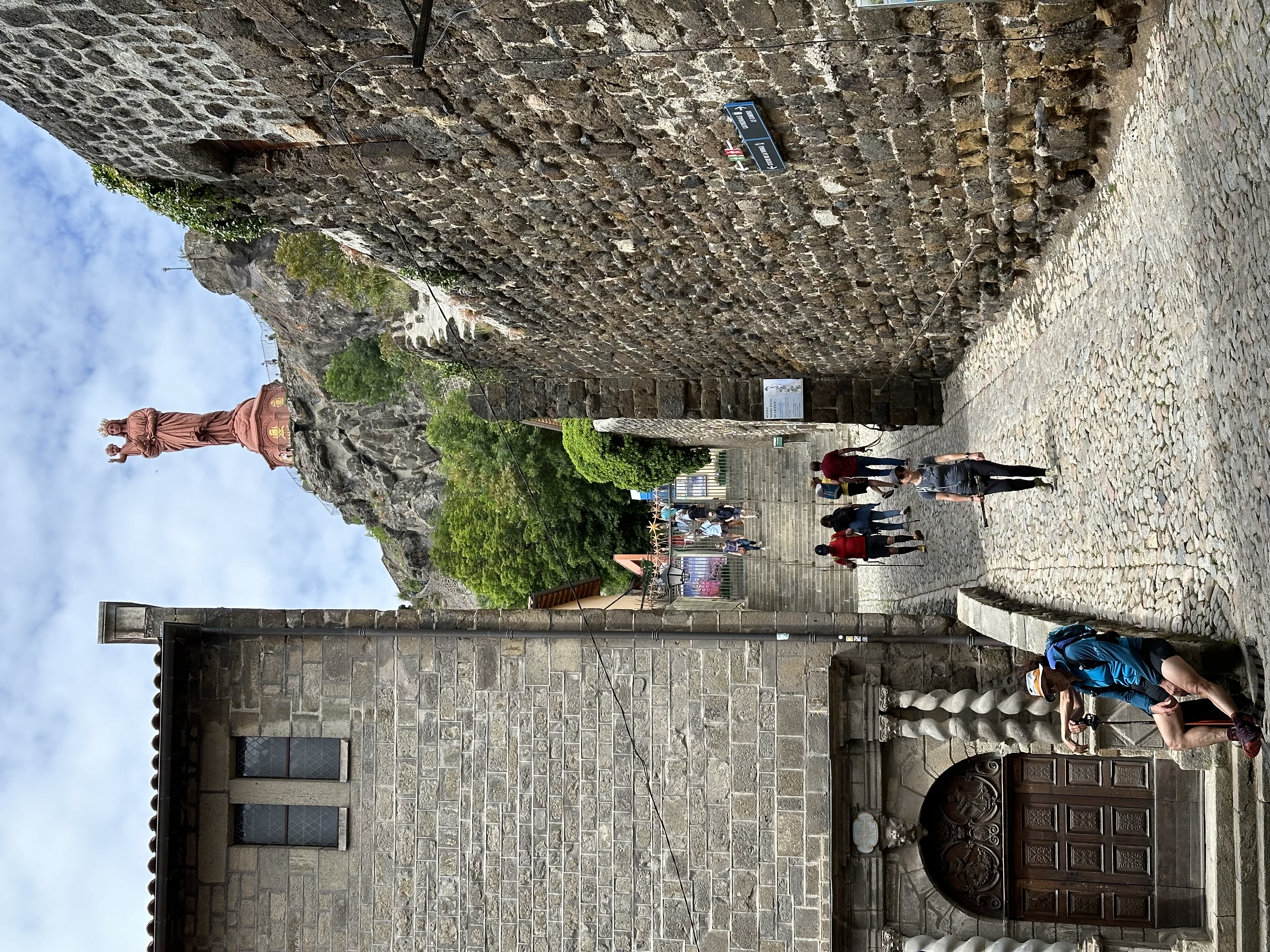 Moderately difficult walk and rather long. We leave St Chely passing through the ancient pilgrims bridge then we commence a gradual ascent of 1 km then we more or less stay level following a path under the tree canopy for 2km. We merge on a bigger road at 4 km of coast grasslands. We enter other woodlands as we get closer to the waterline, at 10.9 we pass the bridge with the creek Ruisseau de Cancels, then soon after we commence an ascent of 1 km that will take us to LaRozere where we can also find a water faucet. We continue the descent and we reach the village of St Come d’Olt boasting the beautiful cathedral dedicated to Cosim and Damian the 2 medic saints and an interesting medieval castle next to that. We continue the walk crossing the bridge on the river and here we have 2 options to reach Espalion: the first one follows the river, initially on the same path shared with the other option then following true tarmac road next to the river, the second one (now the official one) follows a path the goes away from the river with a 2 km climb followed by a second shorter one that takes to a volcanic crater overlooking the valley and now also the site of the statue of the Virgin of the Vermus, then from there we descend the final 3 km to get to Espalion with a beautiful arrival from the path following the river. The track takes us to our inn. We had lunch at the bridge at 10.9 and a long stop at St Comes-d’Olt.