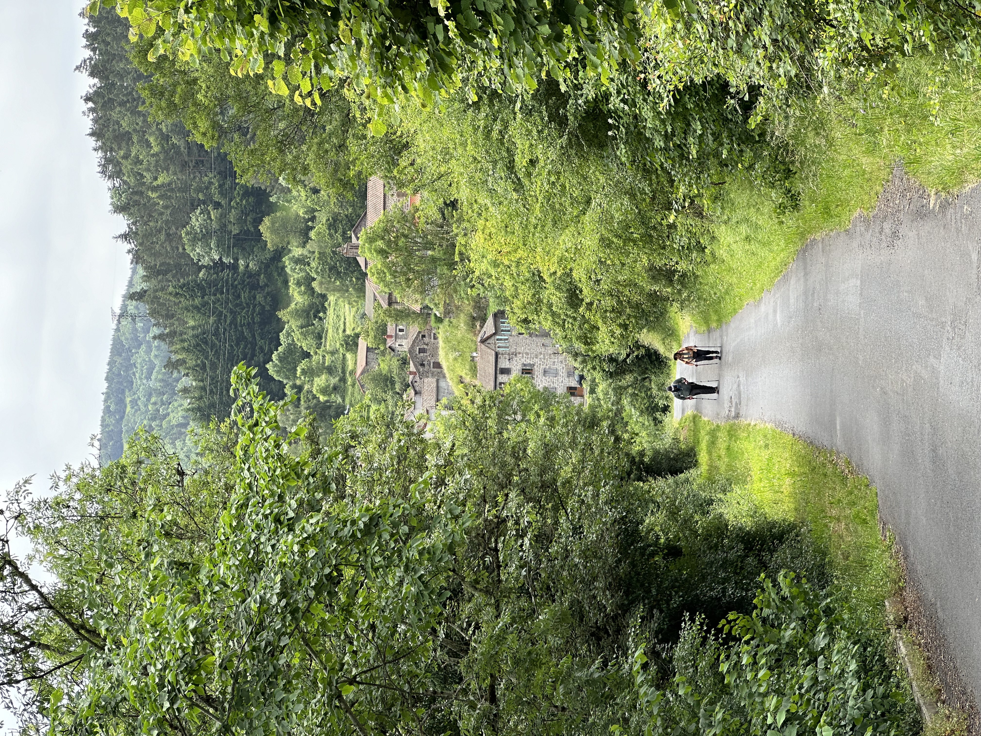 Easy and moderate walk, today we leave the plateau of the Aubrac and the Lozere departement and we enter the Aveyron department. Most historically according to the report of the pilgrims we leave the perilous territory of the Aubrac where you can meet wolves and snow for the more gentle countryside of the River Lot. We leave Nasbinals and after half a km we take a minor road branching right and climbing the hill. At 3.4 we leave the main road taking a path for only walkers (no MTB, no horses, no donkey, no motorised vehicles) as well explained on the post this is a path on private land and conceded to pilgrims by the owners at the condition of not disturbing cattle grazing. At 7.3 we reach to top of the very gradual ascent, beautiful views of the grass lands so far, from here on there will be more woodlands. We descend to the asphalt road and we leave the only-for-walkers section, at 8.1 km we enter the village of Aubrac with is imposing castle of the 12 c. where you will find some open facilities for sustenance. There are some beautiful sections of the path known as draille (piste) running parallel to the famous enclosured grasslands, once used on the transhumance that are lined by beech trees, hazels and other trees. We gradually descend, we reach the small hamlet of Belvezet at 13.2km then we descend to the village of St Chely d’Aubrac, the track ends to the hotel. We had lunch under the trees canopy at roughly 10 km.